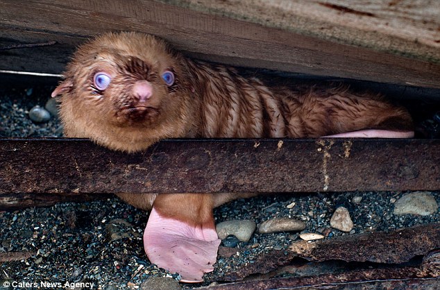 Mladička, ki se je skotil z rdečkasto dlako, je njegova družina zavrgla. Mladička je opazila fotografinja, stiskal se je med debli, stran od ostalih tjuljnev. Ima za to vrsto neobičajne modre oči in rožnate plavuti. Fotografinja ga je uspela ujeti. Ubožec je skoraj popolnoma slep in v divjini ne bi preživel. Mladiček je star približno 4 mesece, pri tej starosti bi moral biti njegov kožušček čokoladno rjav, skoraj črn kadar je moker.