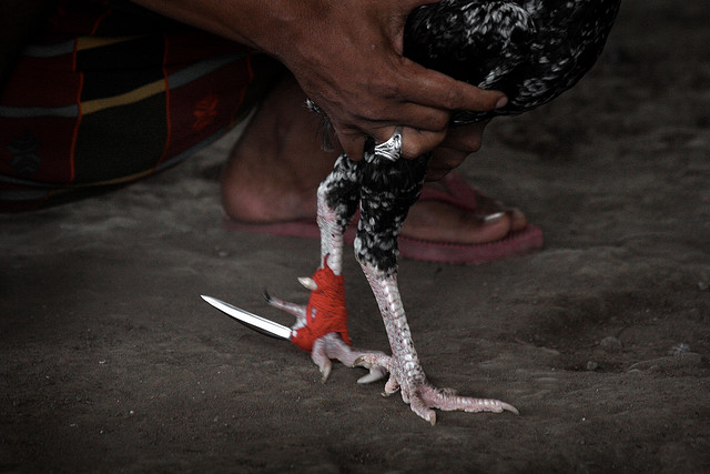 Izvajalci petelinjih bojev, petelinom pogosto na noge privežejo ostra rezila, da so boji še bolj “zabavni”.