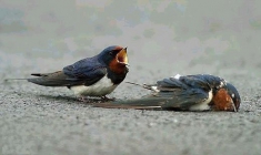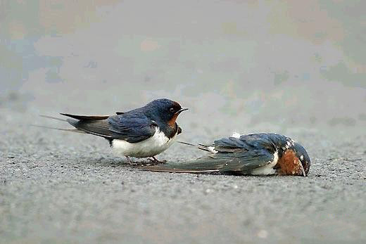 Jata ptičev se je igrala in si iskala hrano ob glavni cesti. Mimo je pripeljal tovornjak. Zadel je eno od ptic in ta je nemudoma mrtva obležala na cestišču.