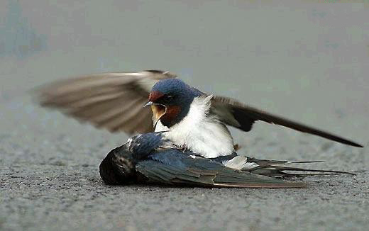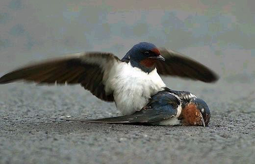 Druga ptica iz jate, samec, je čim je to videl, takoj priletel zraven. Kot da ne bi mogel verjeti, da je njegova partnerka mrtva, je stal ob njej, glasno čivkal in jo celo poskusil sam dvigniti. Ko je mimo pripeljal še en avto, se je ptič umaknil le toliko, da je ta šel mimo, nato pa se takoj vrnil ob svojo ljubljeno. Ko je njeno mrtvo telesce veter kamiona z druge strani ceste za hip dvignil v zrak, je dobil trenutek upanja in takoj poletel ob njeni strani. A trupelce je spet obležalo na tleh in ptiček nikakor ni vedel, kaj bi lahko še storil da bi svojo drago spet obudil k življenju.