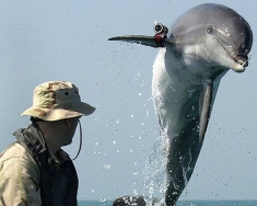 Delfini pomagajo ameriški vojski že več kot 40 let. Izurjeni so, da najdejo podvodne mine, pa tudi, da opozorijo na sumljive plavalce ali potapljače. Tako delfini varujejo za javnost zaprte vode vojaške baze. Če delfin zazna karkoli sumljivega, se dotakne senzorja na čolnu, da opozori svojega trenerja. Ta mu nato na nos postavi signalno lučko ali zvočni oddajnik, in delfini so naučeni, da nato odplavajo do sumljivega predmeta/človeka, se vanj zaletijo, da jim senzor pade z nosu in priplavajo nazaj. Nato delo prevzame vojska.